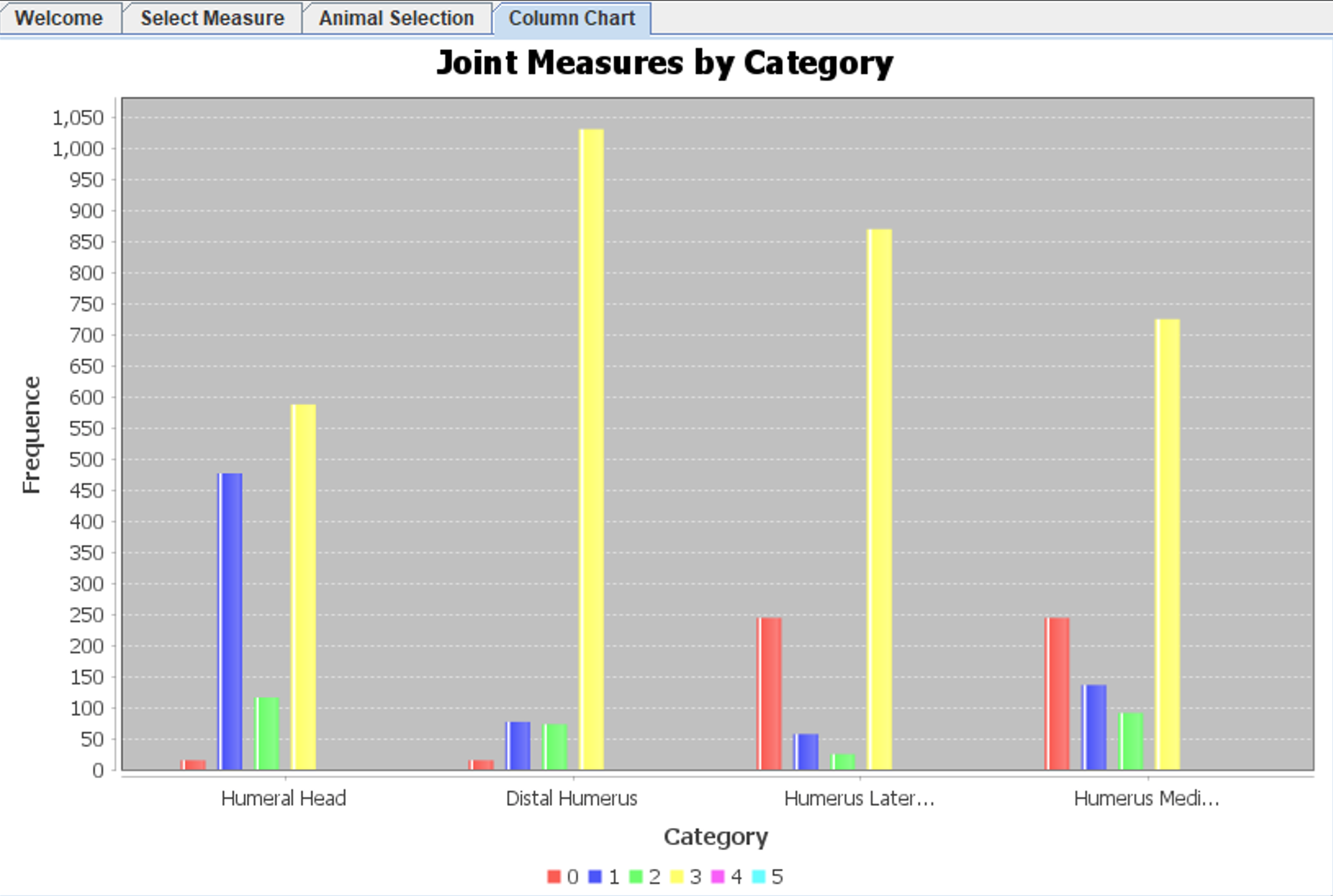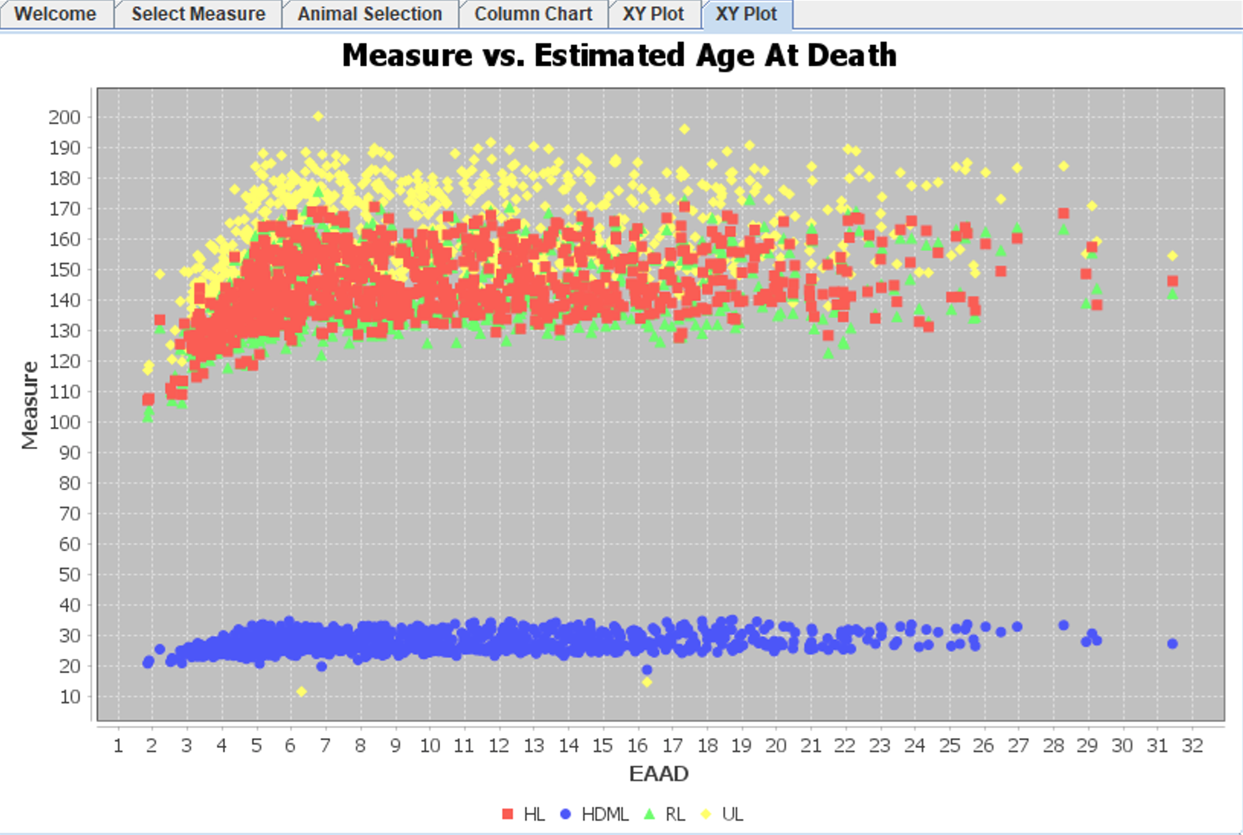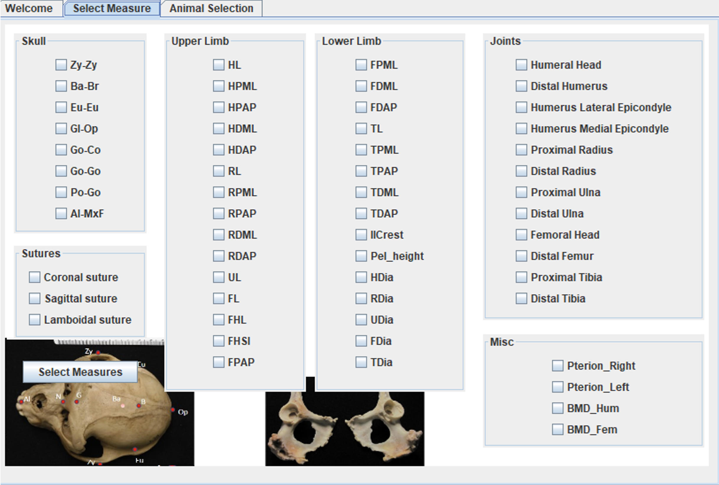 A subset of animal subjects and targeted bone measures can be selected using features on the Search menu and the Measure menu.