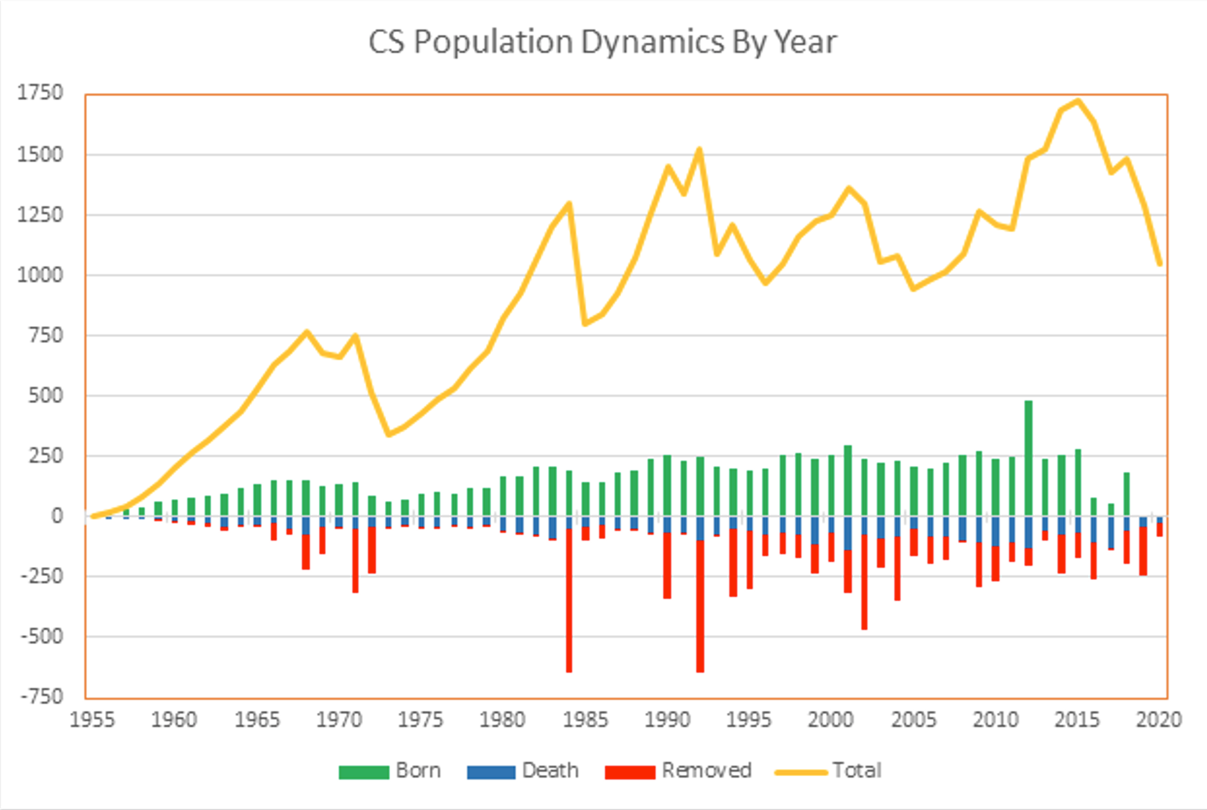 Headcount line chart for the CS colony (1955~2020, Analytics | Headcount Trend)
